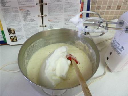 Chú ý: bạn đừng trộn quá lâu khiến bong bóng xì hết và bánh sẽ bị chai.
