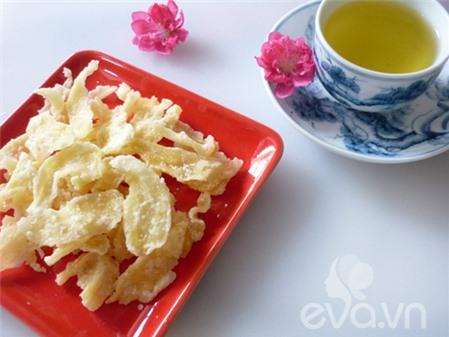 Cũng đơn giản không kém món mứt gừng dẻo, cách làm mứt gừng khô khó. Những miếng mứt gừng thơm, khô, quyện với đường trắng sẽ làm ấm lòng những ngày Tết giá lạnh. Bạn có thể thái gừng thành hình hoa, sau khi hoàn thiện những miếng mứt sẽ có hình bông hoa mai vàng rất đẹp mắt.