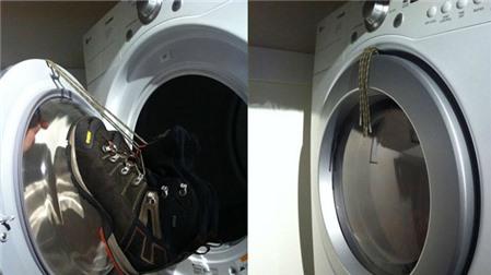 - Móc dây giày lên phần trên cùng của cửa máy sấy rồi cẩn thận đóng chắc cửa lại, dây giày nên nằm ngoài máy sấy. Treo giày vào cửa sẽ giúp giày không bị va chạm với lòng máy sấy, tránh làm hỏng máy đồng thời giúp bảo quản đế giày.