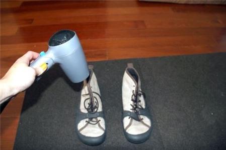 Đây là một trong những cách làm khô giày nhanh hữu dụng nhất. Hãy nhìn vào kết cấu đôi giày của bạn. Nếu giày bạn có chất liệu là sợi cotton hoặc tổng hợp và không có đế cứng hay đế gel thì bạn có thể dùng máy sấy. Đối với các loại giày thể thao