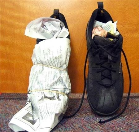 - Vo tròn những mẩu báo thành viên nhỏ rồi nhét vào giày sao cho thật căng.