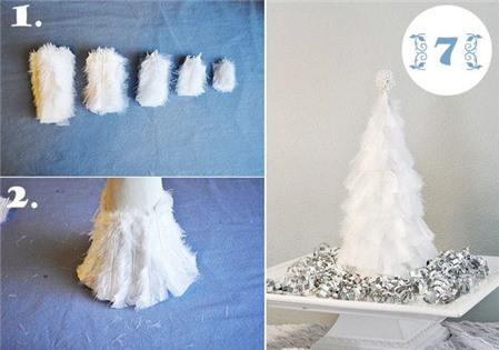 Cách làm này gần giống như cách 1 nhưng bạn thay giấy báo bằng lông vũ nhé! Để tạo dáng tán cây dễ hơn, bạn nên chia đều từng loại lông lớn nhỏ và cắt bỏ thót nhọn của chúng đi. Tiến hành dán vòng quanh cốt cây lần lượt từ hàng lớn tới hàng cỡ nhỏ là bạn sẽ có ngay một cây thông màu trắng xóa y như tuyết vậy.