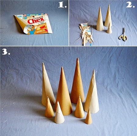 Bạn dùng một tấm bìa cứng cuộn thành hình dáng chiếc phễu rồi cắt bằng đáy và dán tròn lại với nhau để tạo thành một hình chóp nón làm cốt cho cây thông nha! Tùy theo sở thích mà bạn có thể thay đổi hình dạng hoặc kích thước của chóp nón này.