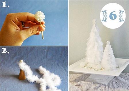 Quấn quanh cốt cây bằng sợi bông hoặc kẽm rồi bạn dùng một chùm hạt cườm để trang trí phần ngọn cây. Thế là, bạn đã có ngay một cây thông màu trắng toát xù bông trông thật ngộ nghĩnh rồi!