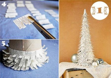 Bạn cắt những miếng báo nhỏ hình chữ nhật các tua rua rồi tiến hành dán đều quanh cốt cây thông. Đây là cách làm