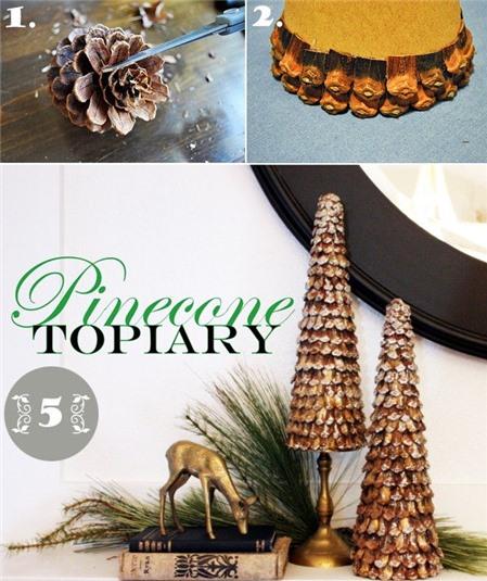 Sử dụng những quả thông khô, bạn dùng kéo cắt đi các vảy quả thông rồi xếp chúng thành từng nhóm lớn nhỏ. Tiến hành dán xếp hàng vẩy lớn trước rồi nhỏ dần về phía ngọn cây thông. Bạn có thể sử dụng sơn hoặc nhũ để quét thêm một lớp giúp cây thông thêm rực rỡ và bắt mắt.