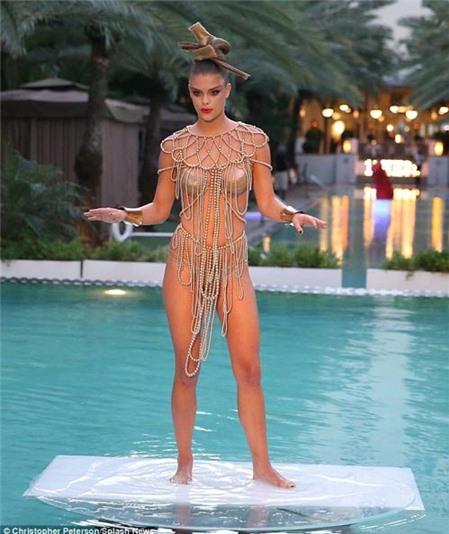 Người mẫu Nina Gagdal mặc bikini có thiết kế ấn tượng gồm bikini màu đồng ở bên trong và khoác áo choàng lưới bên ngoài khi thực hiện bộ ảnh cho tạp chi French Photo.