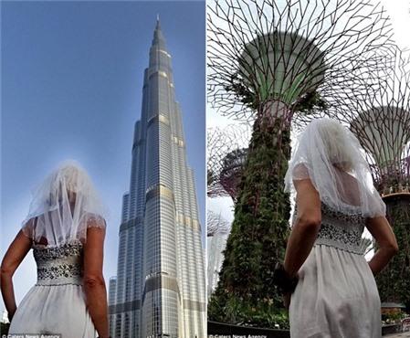 Pavlina mặc váy cưới đứng trước tòa tháp đôi Burj Khalifa ở Malaysia (trái) và khu vườn vịnh ở Singapore.
