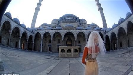 Cô dâu đứng một mình lẻ loi trước nhà thờ Sultan Ahmed ở Istanbul, Thổ Nhĩ Kỳ.