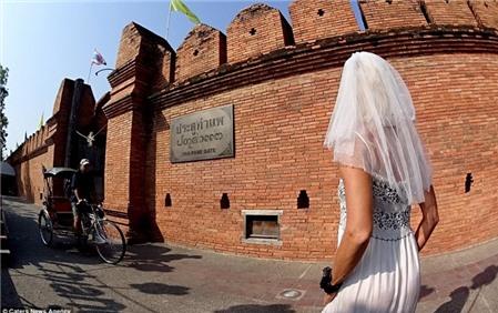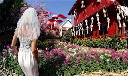 Cô mặc váy cưới chiêm ngưỡng vườn hoa rực rỡ trong một ngôi chùa ở Chang Mai, Thái Lan.
