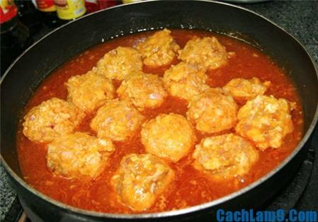 , khi thịt đã ướp đủ các bạn cho dầu ăn thoa đều lên tay và viên thành từng viên tròn xếp ra đĩa. Bắc chảo lên bếp cho dầu ăn vào đun nóng già, sau đó cho tỏi phi thơm rồi đổ hành tây băm nhỏ vào đun khoảng 2-3 phút, rồi đến cho nước sốt cà chua vào đun sôi.