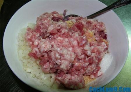 Cho thịt heo xay vào bát thêm hạt nêm, muối, nước mắm, được, hạt tiêu và hành tây