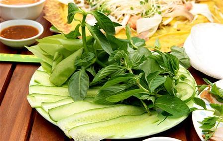 Bánh cho ra đĩa bày cũng với các loại rau sống và nước mắm đã pha là có thể thưởng thức rồi.