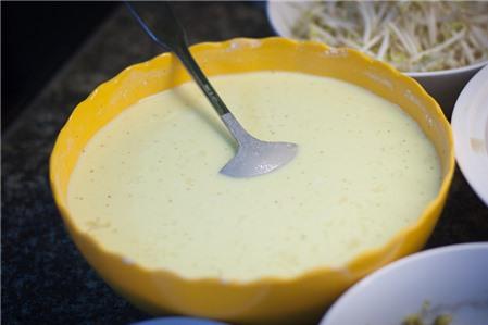 Bột đem khuất đều lại rồi đợi khi chảo thật nóng cho một muôi canh bột vào tráng đều khắp mặt chảo.