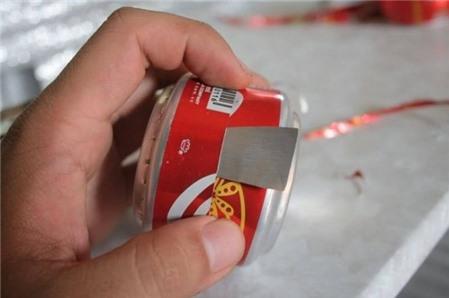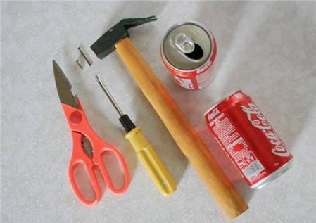 Các dụng cụ cần thiết: 2 lon coca, búa, tua vit, kéo và đinh