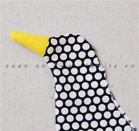 Dùng đường khâu chỉ đen để nối phần cong của bàn chân vào phía dưới chú chim.