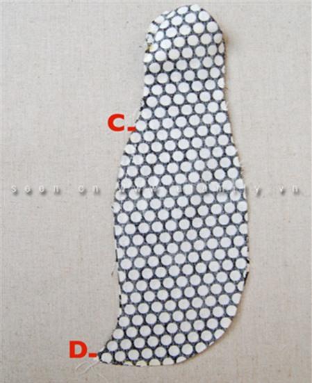 Ghim khoảng cách từ điểm B đến điểm C đã được chừa lại để nhồi bông - với các đường mép vải giấu vào bên trong. Dùng một đường khâu giấu chỉ để đóng kín đường nối.