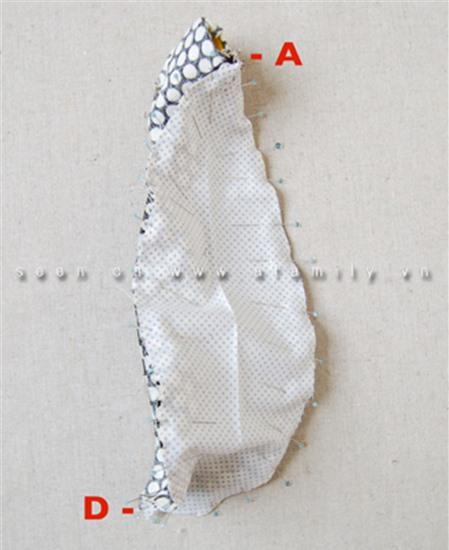 Sau đó, dùng kim ghim ghim phần bụng dọc theo mặt phải của hai thân chim đang mở. Điểm bắt đầu ghim là điểm A đã được đánh dấu, ghim dọc theo mép vải của mỗi bên cho đến khi bạn tới điểm đánh dấu D. Làm cẩn thận và từ từ để đảm bảo các ghim nút giữ được đường cong dọc theo thân chim.