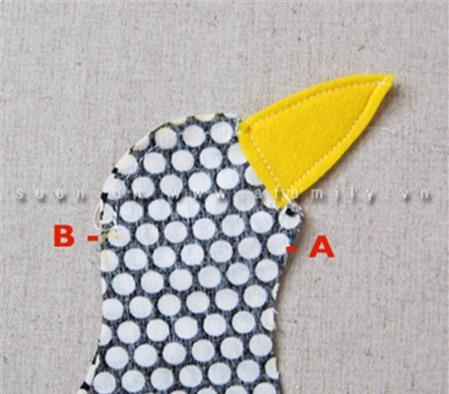 Áp hai mặt phải của phần đầu lại vừa vặn với nhau. May một đường từ điểm A cách mỏ khoảng 0.7cm – 1cm cho đến điểm B ở phía đối diện của điểm A như hình bên. (2 điểm này cũng đã được đánh dấu trên mẫu vẽ ban đầu).