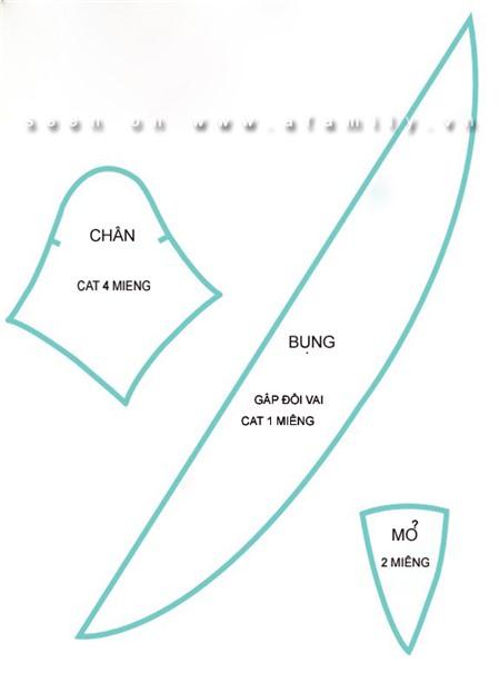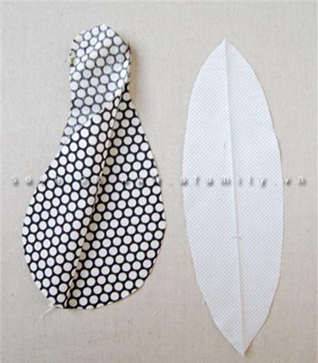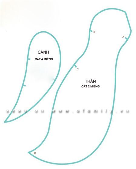 Áp hai mặt phải của miếng đuôi chim lại với nhau, khâu vòng quanh đuôi chừa lại đường khâu phía dưới để lộn mặt phải lại.