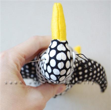 Nhồi phần cánh chim và đóng kín đường nối bằng một đường khâu màu đen tương tự như cách bạn đã làm với phần thân của chú chim.