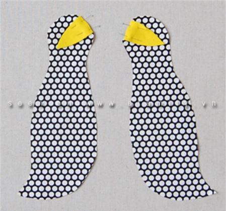 Ghim cánh trái và phải ở các bên đối diện của chim cánh cụt. Chúng cần phải song song với nhau và uốn cong về phía sau của chú chim. Dùng một đoạn chỉ thêu màu đen để đính một bên cánh lại, sau đó xuyên kim qua phía đối diện để đính chiếc cánh tiếp theo. Để chắc chắn bạn có thể tiếp tục đâm kim ngược lại để đính thêm một đường khâu nữa. Kết thúc bằng một nút chỉ và ẩn nó xuống phía dưới xương cánh như cách bạn đã thực hiện ở phần đóng đường nối của thân chim.
