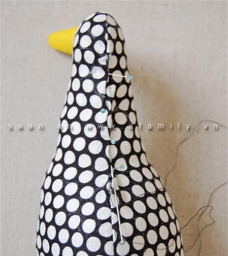Lộn phần chân chim vừa khâu, miết cho đường khâu trơn mượt rồi nhồi bông vào chân. Nhồi từ từ để giúp chân căng tròn và mềm mại, đặc biệt là tại các điểm cong mở của bàn chân .