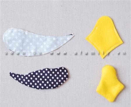 Cắt mẫu giấy rồi áp lên vải, cắt vải theo mẫu. Khi cắt bạn cần chắc chắn là bạn cắt hai phần thân ngược nhau. Phần cánh cũng tương tự, cắt hai cặp đối mặt với nhau. Còn lại là phần chân, mỏ và bụng trước.