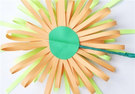 Đầu tiên bạn dán 1 hình tròn lên đầu sợi kẽm, phết keo đều viền xung quanh. Đặt 1/2 số sợi giấy lên xung quanh rồi dán chập đầu kia lại.