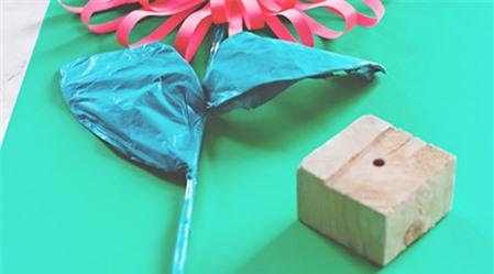 Gập sợi kẽm làm đôi, bẻ cong để tạo hình lá rồi lấy giấy nhún bọc lại, dùng keo dán chắc chắn và gắn vào cành hoa để cành hoa thêm tự nhiên!