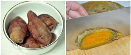 4 củ khoai lang to vừa, chọn loại khoai bí có màu vàng đẹp mắt, đồng thời chọn những củ kích cỡ tương tự nhau để khoai chín đều.