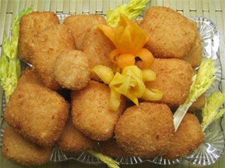 Đậu phụ tươi (loại đóng hộp) cắt xúc xắc to thấm khô nước tẩm với hỗn hợp bột chiên tôm giòn, gia vị, hạt tiêu (đánh sền sệt với nước hoặc có sữa tùy khẩu vị). Cho vào rán vàng trong chảo ngập dầu. Để ráo bớt dầu thì xếp ra đĩa trang trí.