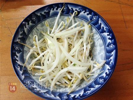 - Xếp giá đỗ, hành tây vào bát rồi chần miến lên trên. Sau đó, bạn xếp đến lươn, rau răm