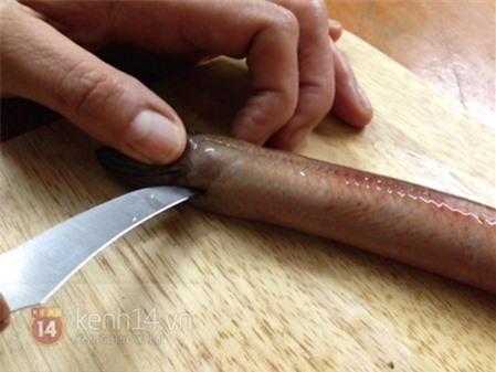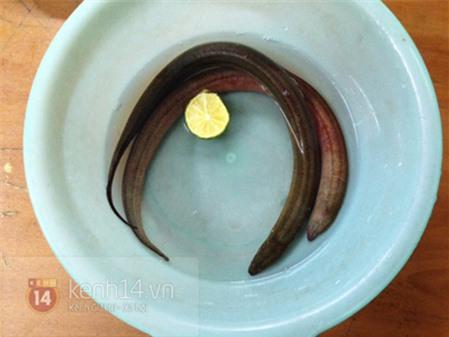 Các bạn chú ý: từ bước này trở đi, sẽ không được rửa lươn vào nước nữa nhé! Nếu dính nước, lươn sẽ bị tanh.