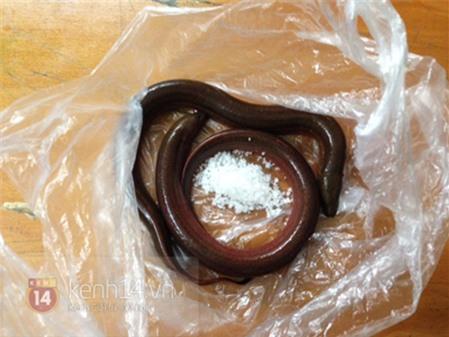 - Nếu không mua được lươn làm sẵn, các bạn cho lươn vào túi nilon, thêm chút muối, buộc kín rồi lắc mạnh khoảng 2'. Làm vậy để lươn ra hết nhớt.