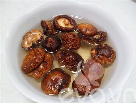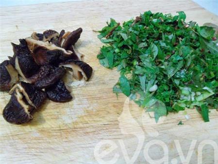 Vớt nấm hương ra giữ lại phần nước rồi thái làm đôi. Thì là, hành hoa, rau dăm nhặt sạch rửa nhiều nước rồi thái nhỏ.