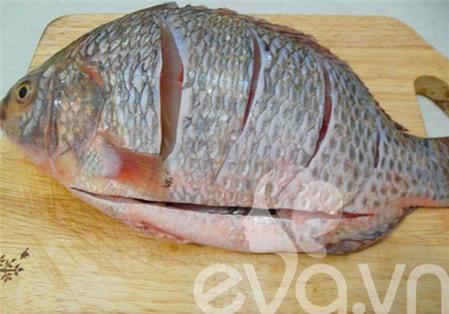 Cá rô phi làm sạch, dùng dao khứa lên mình cá rồi cho vào nồi ướp gia vị