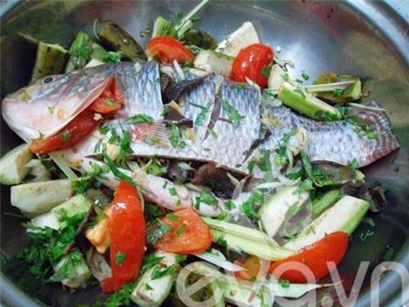 Cho hỗn hợp trên vào bụng cá, hai bên mang cá và cả mình cá. Cho khoảng 3 - 4 thìa dầu ăn cùng nước nấm hương. Ướp trong khoảng 15-20 phút rồi đặt lên bếp đun nhỏ lửa. Thỉnh thoảng cho một ít nước sôi vào để tránh bị khê nồi.