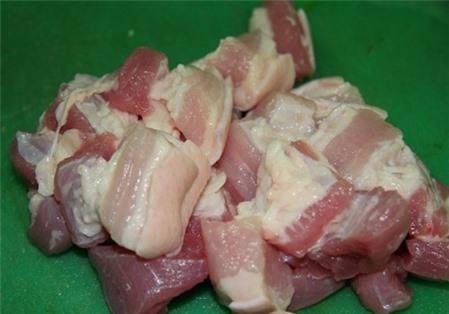 thịt. Thái thịt ba chỉ thành miếng mỏng vừa ăn, đẹp nhất là thái con chì.
