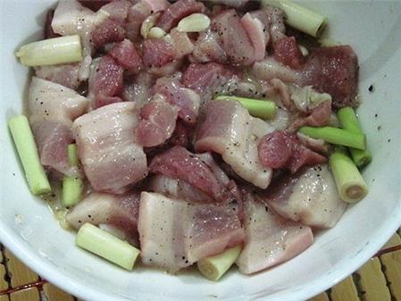 Thịt ba chỉ thái xong cho vào bát ướp với hành tím băm nhuyễn và một muỗng canh nước mắm, 1 muỗng cà phê tiêu trong 30 phút cho thịt thấm gia vị