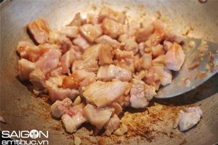 Bước tiếp theo bắc chảo lên bếp đun nóng chảo, cho khoảng 1 thìa nhỏ dầu ăn vào chảo và phi thơm phần hành trắng. Cho thịt ba chỉ đã ướp vào rang tới khi thịt săn lại, cháy vàng cạnh miếng thịt mỡ tiết ra thì cho đường vào.
