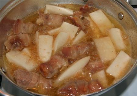 Bạn hãy tiếp tục đảo tới khi đường tan hết bám quanh miếng thịt thì cho phần củ cải vào xào cùng. Bạn đảo đều củi cải muối cùng thịt trong khoảng 5 phút cho củ cải và thịt thấm đều gia vị. Cho vào chảo nửa bát ăn cơm nước lọc rồi đun sôi sau đó vặn lửa nhỏ đậy nắp chảo rim thịt và củ cải trong nồi.
