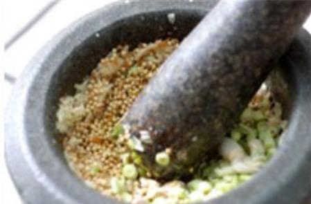 Bạn cạo sạch vỏ nghệ, vỏ riềng, bóc bỏ lớp vỏ ngoài của sả đi, sau đó bạn cắt nhỏ nghệ, riềng và sả rồi cho vào cối giã nhuyễn cùng hạt rau mùi. Nhiều bạn hay sử dụng máy xay để xay hỗn hợp này, tuy nhiên Lamsao.com khuyên bạn nên dùng cối giã để hỗn hợp nhuyễn hơn giúp món thịt nướng được thơm ngon hơn.
