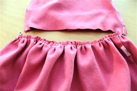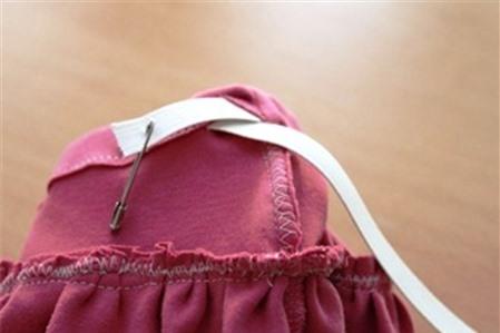 Phần thân váy phía dưới được may sát mép trên vải và rút chỉ cho chun nhún lại, nhún sao cho co hẹp vừa với cạp váy thì thôi. Bạn may hai đường chỉ song song bằng mũi chỉ thưa để rút chỉ dễ dàng hơn mà không lo đứt chỉ, rút từng chút một rồi dàn đều ra khắp vòng thân váy.
