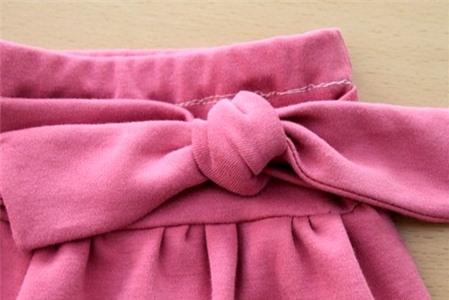 Thắt nơ cho váy nhé, nơ chỉ để làm điệu thôi, nhưng nếu cạp hơi rộng thì dây nơ cũng góp phần thắt chặt cạp váy vào eo bé. Nơ rất giản dị, chỉ với nút thắt thông thường, nhưng bé sẽ thích lắm đấy!