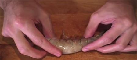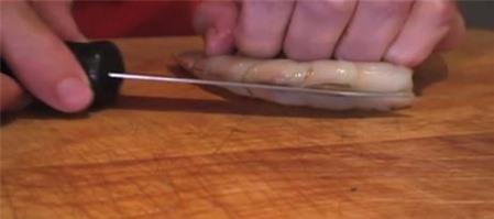 Bạn dùng dao, khứa nhẹ dọc sống lưng tôm rồi lấy ra phần chỉ đất ở lưng tôm một cách dễ dàng.