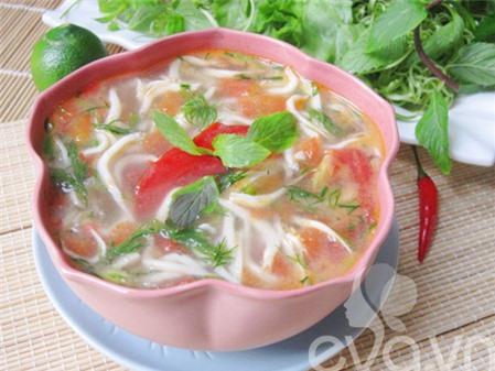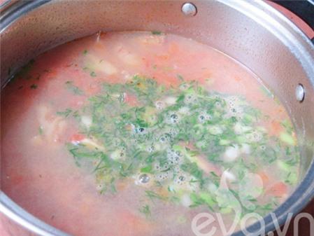 Nêm nếm thêm hạt nêm cho vừa miệng, rắc hành và thì là thái nhỏ vào. Múc canh ra bát to, ăn nóng cùng rau sống và cơm.