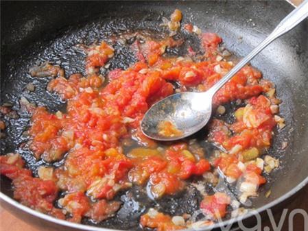 vào xào cho cà chua chín mềm, dùng thìa dằm nhuyễn.