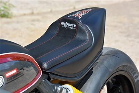 Yên solo với khung bằng nhôm tấm và bọc da kết hợp với những đường chỉ tương phản.