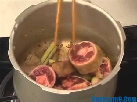Bước 4: Cho đuôi bò đã ướp vào nồi áp suất thêm nước lạnh hầm 20 phút cũng chờ nguội vớt ra như đối với xương heo.